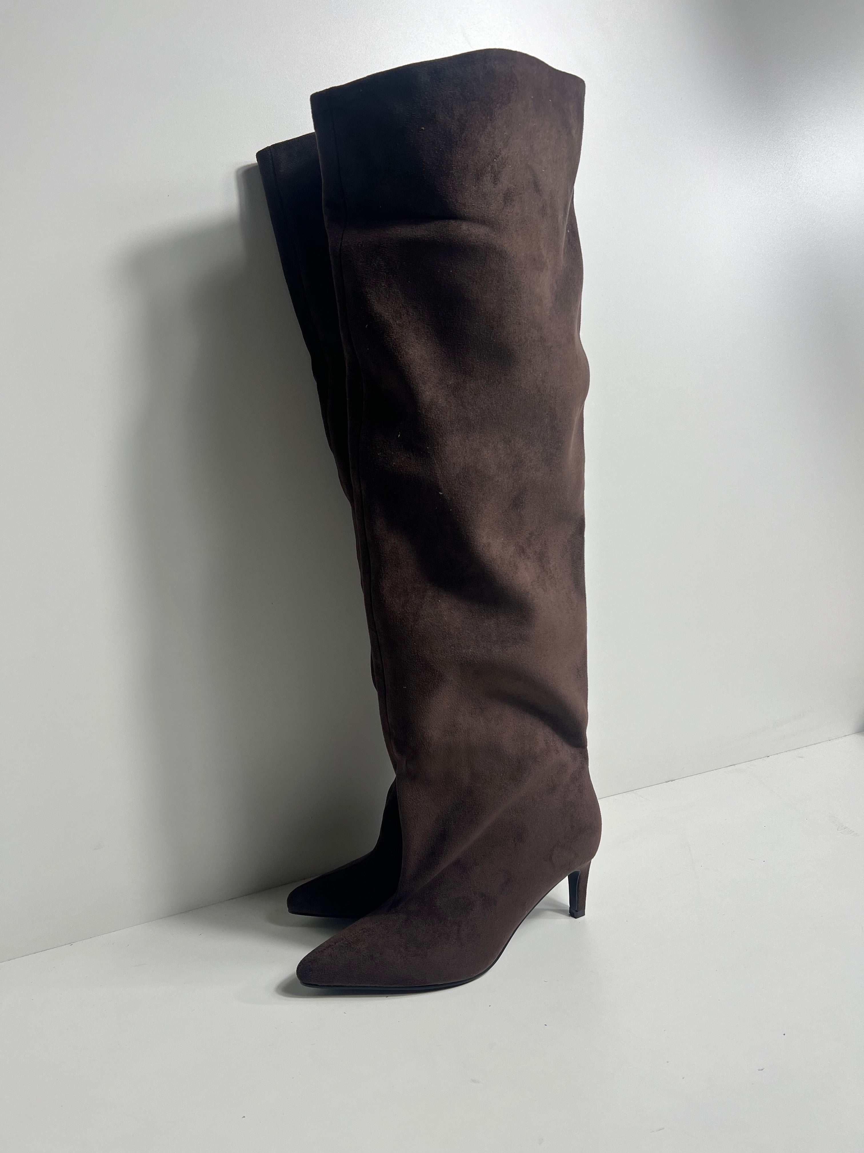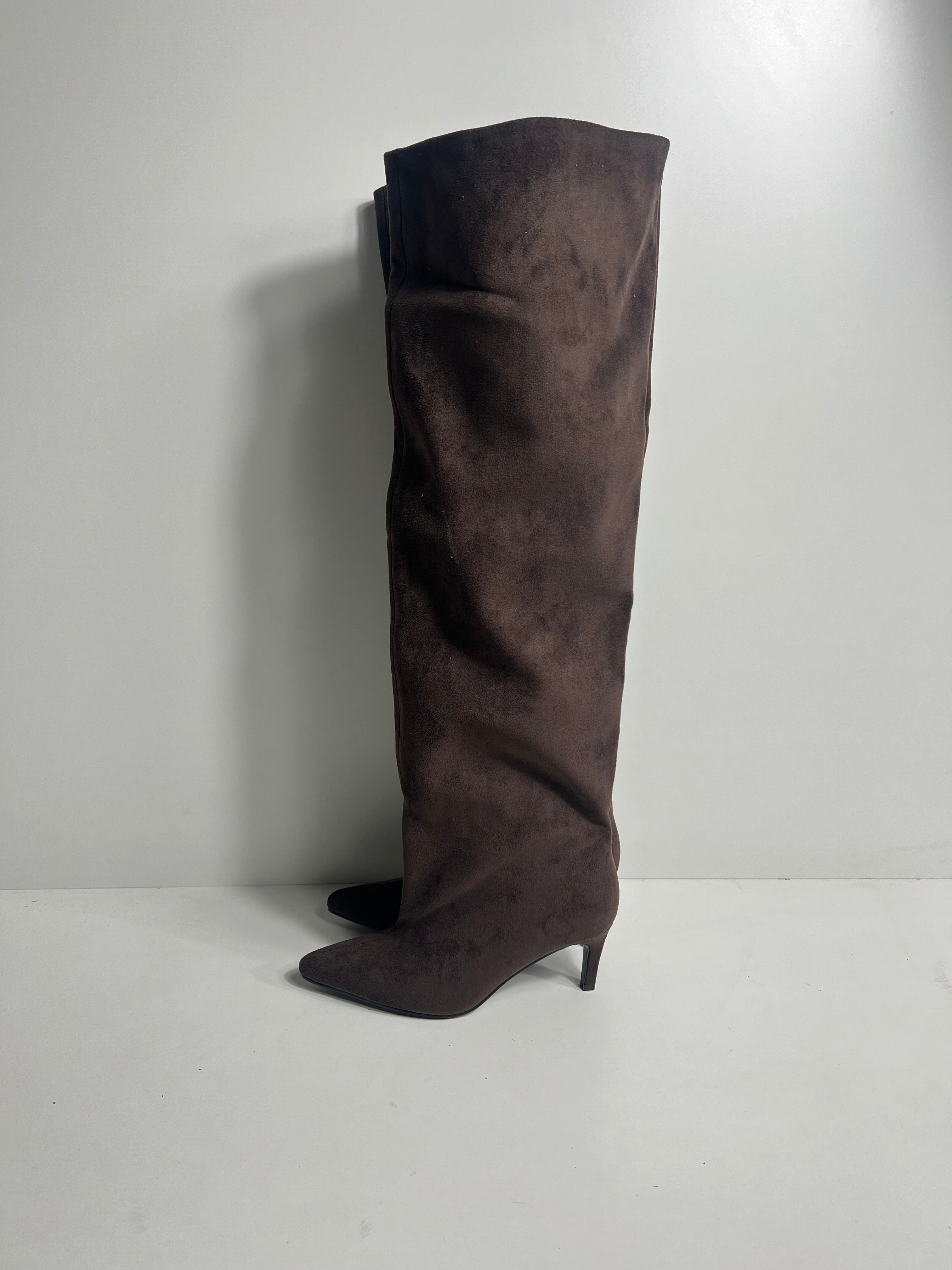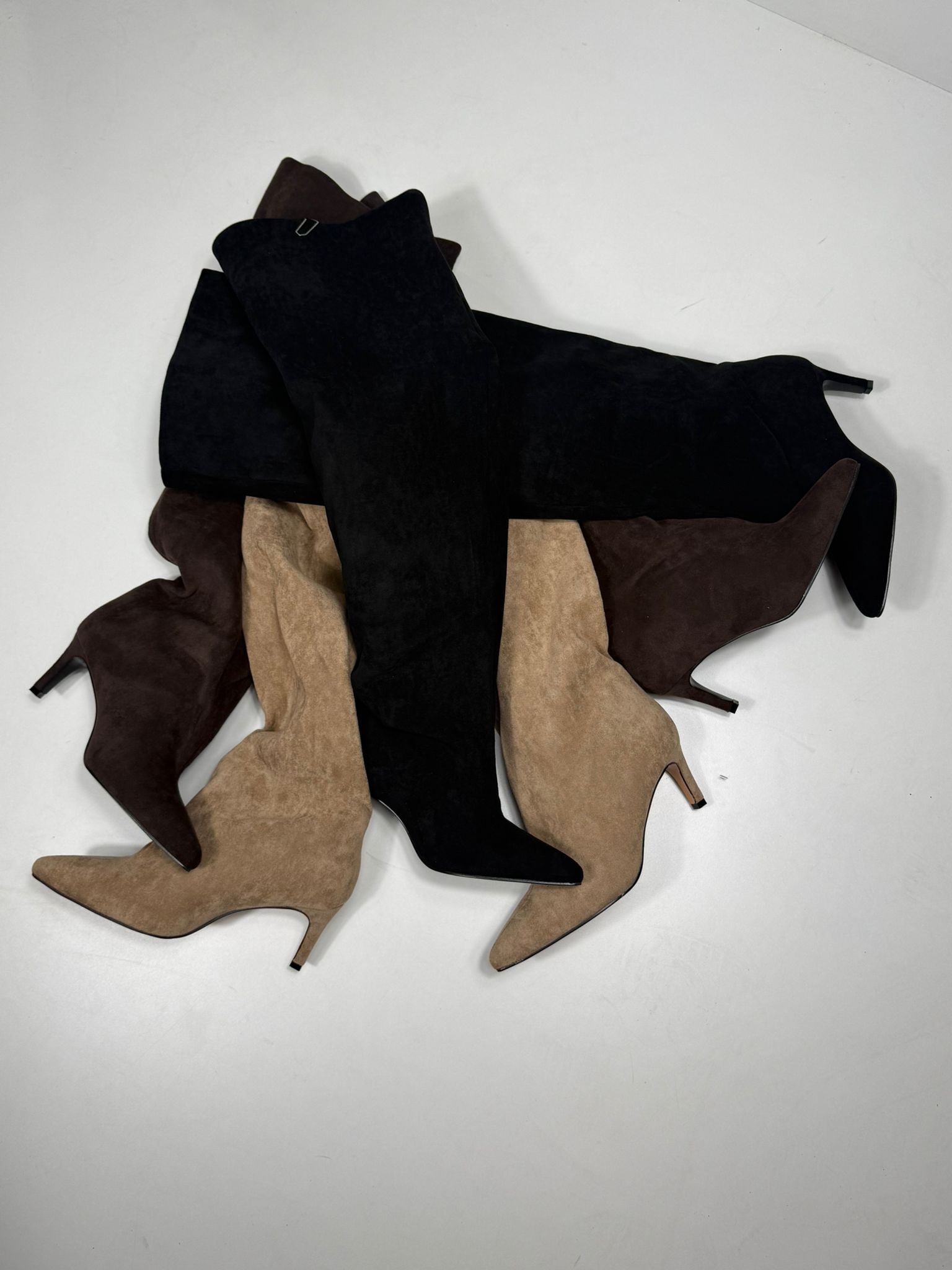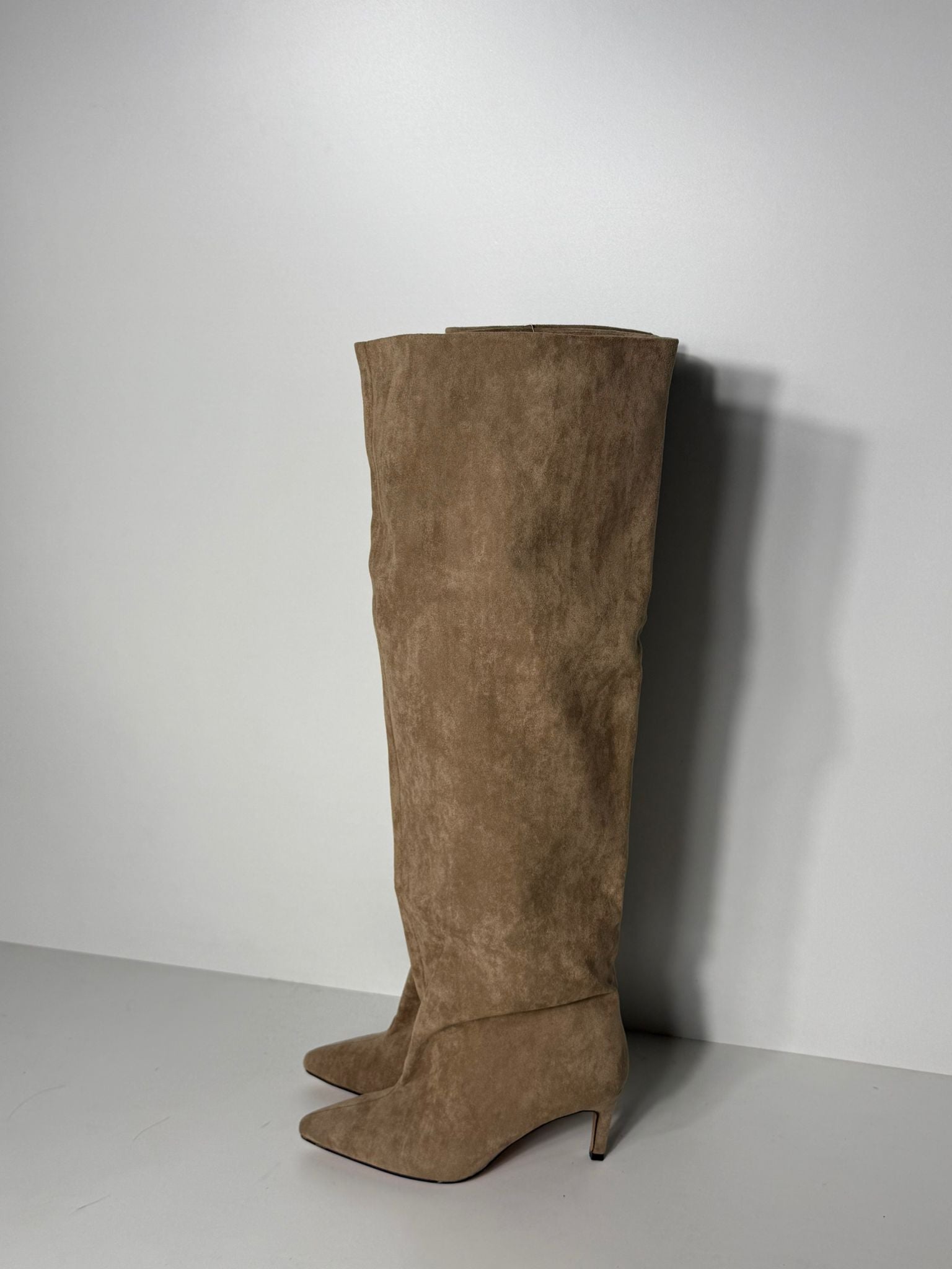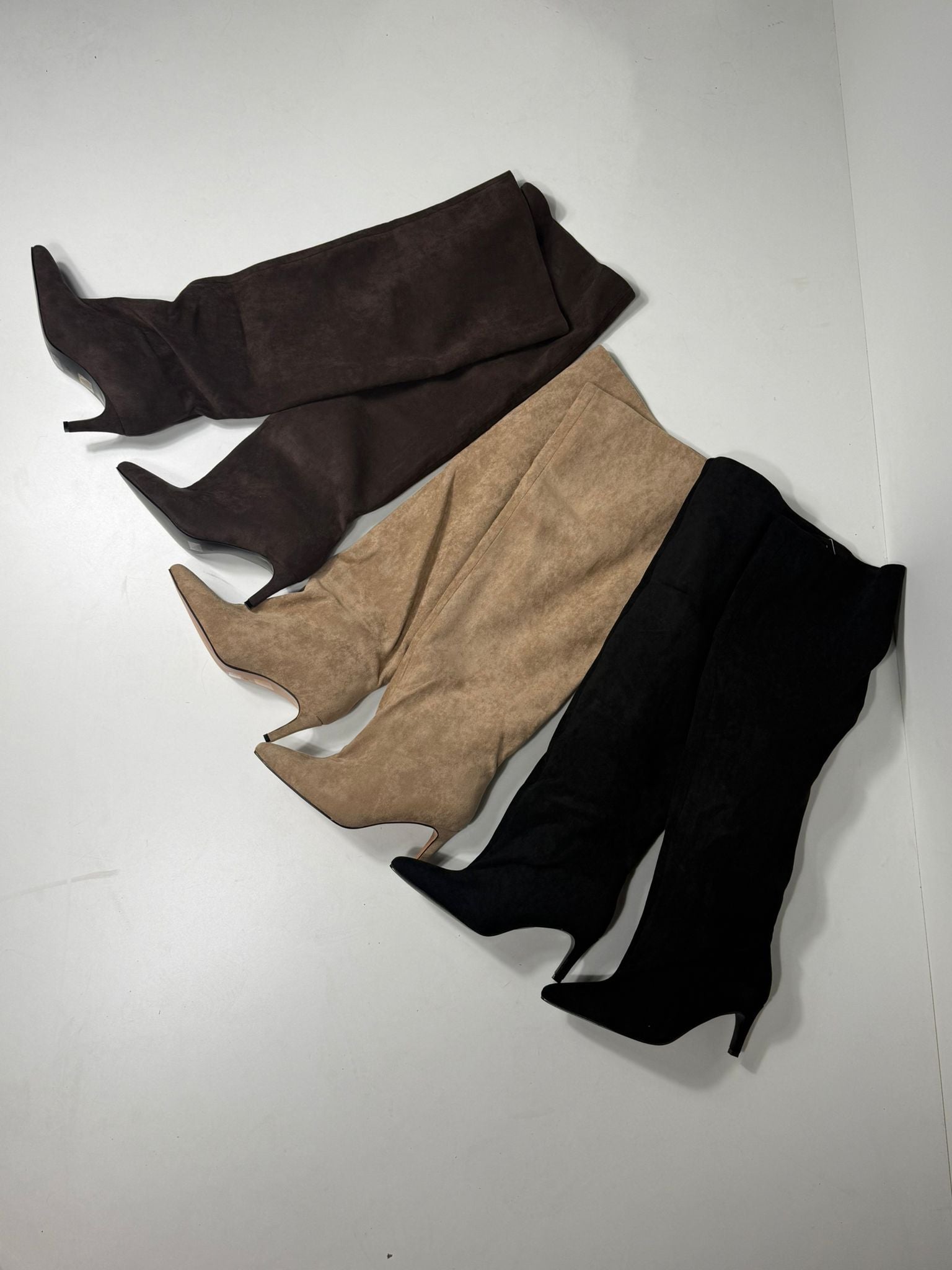 Accessorio chic ed elegante per la stagione fredda. Lo stivale Kandy è realizzato in eco camoscio con un comodo tacco da 7cm e un gambale ampio che arriva sopra il ginocchio. Aggiungi un tocco di stile al tuo outfit e proteggiti dalle temperature rigide.