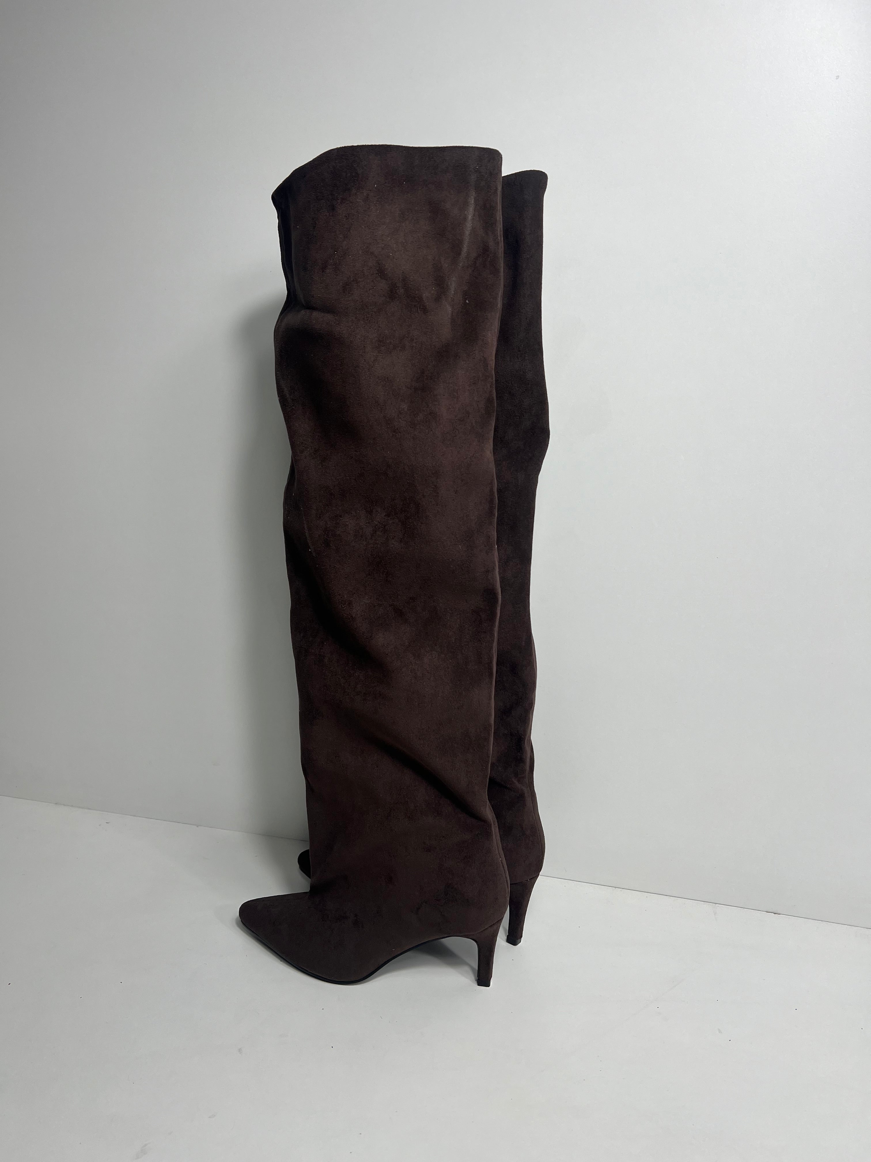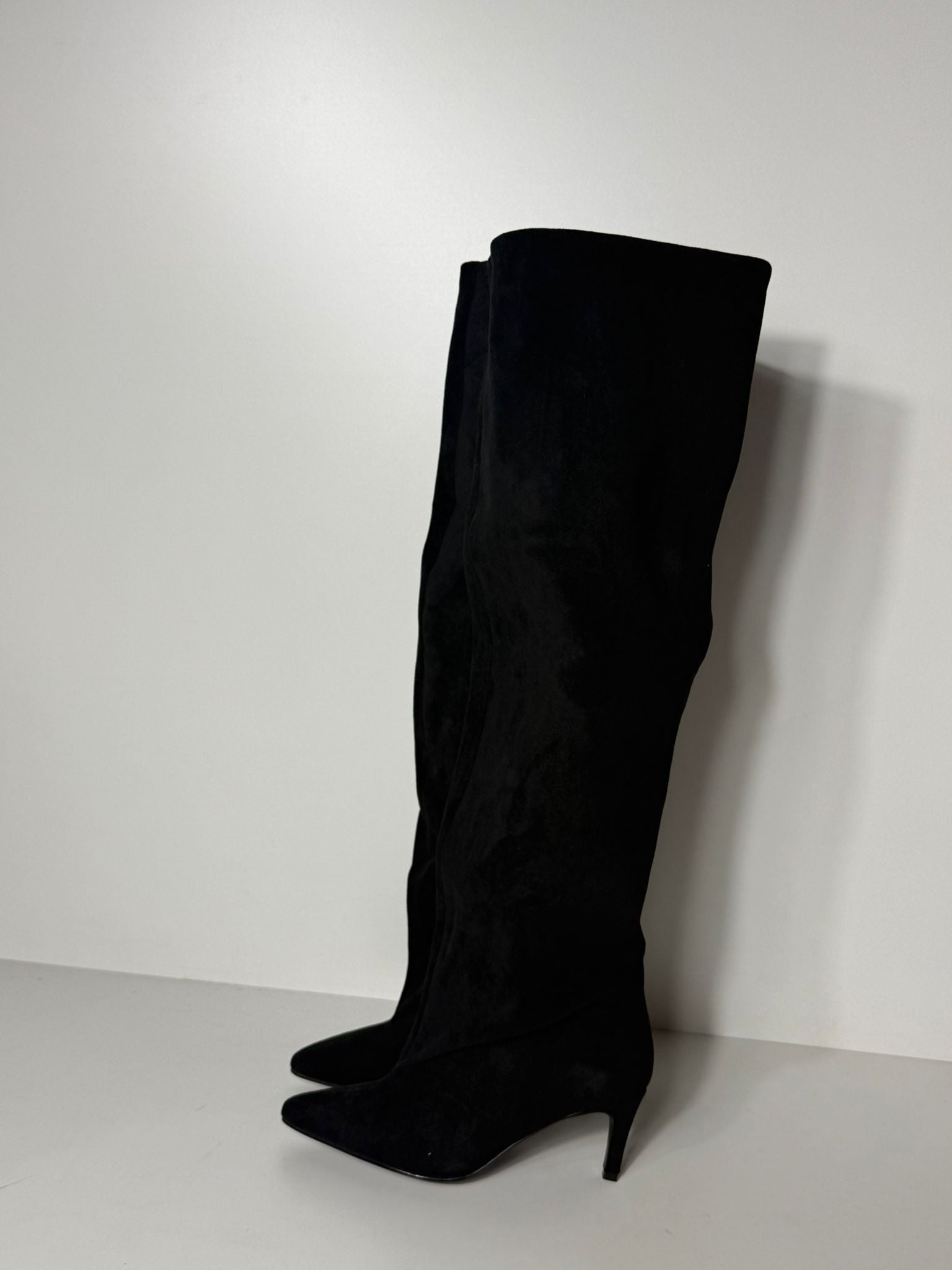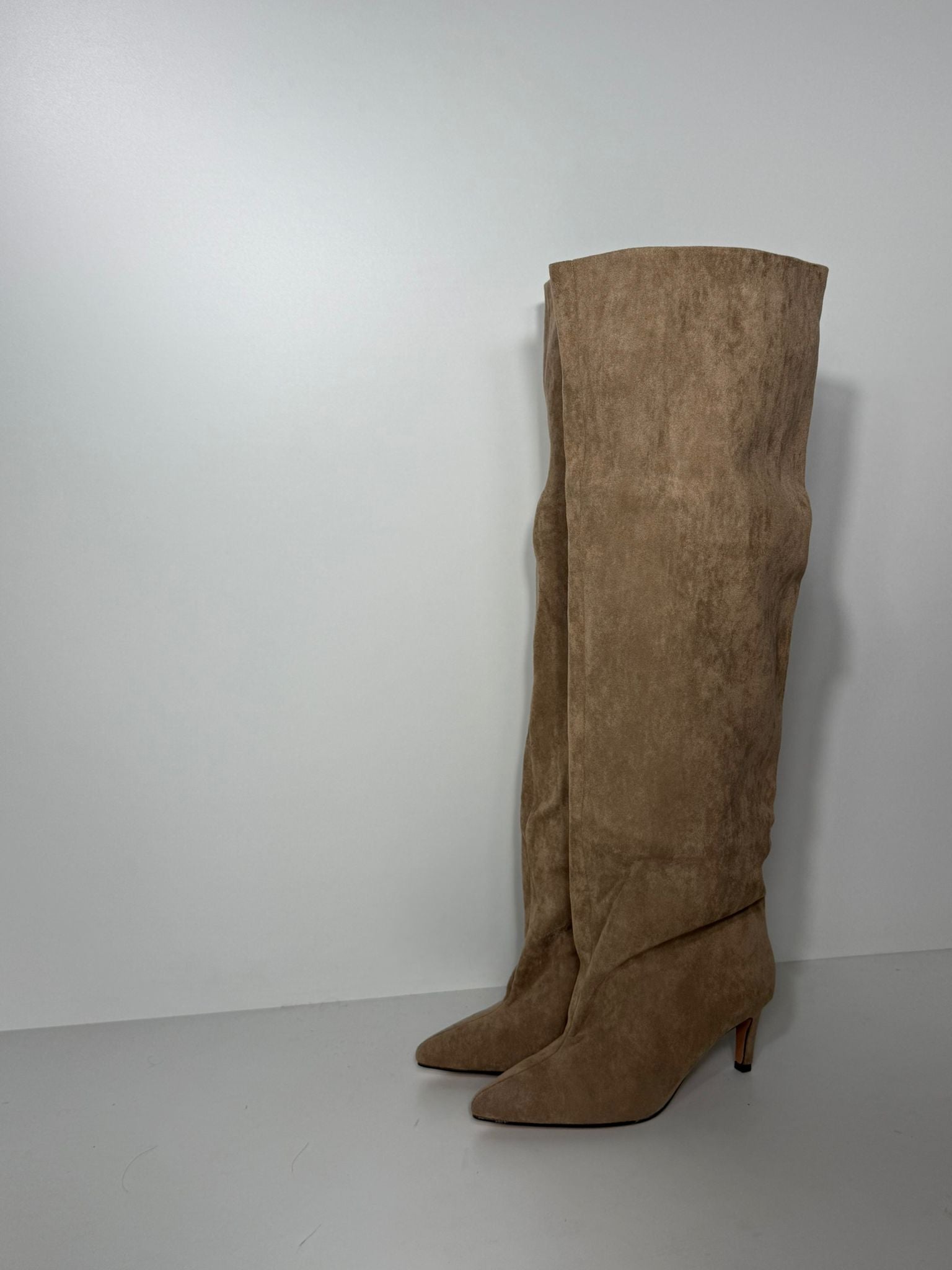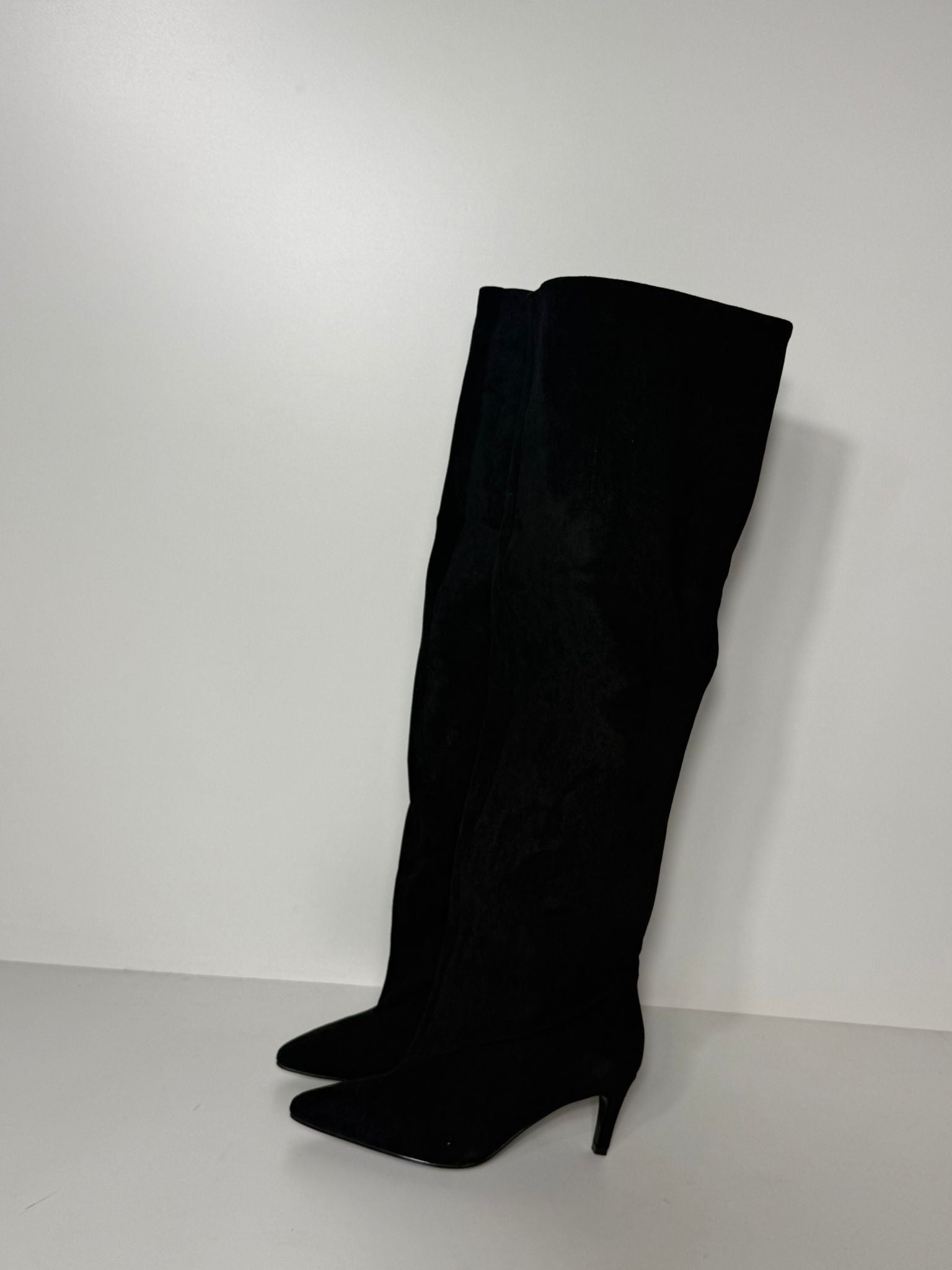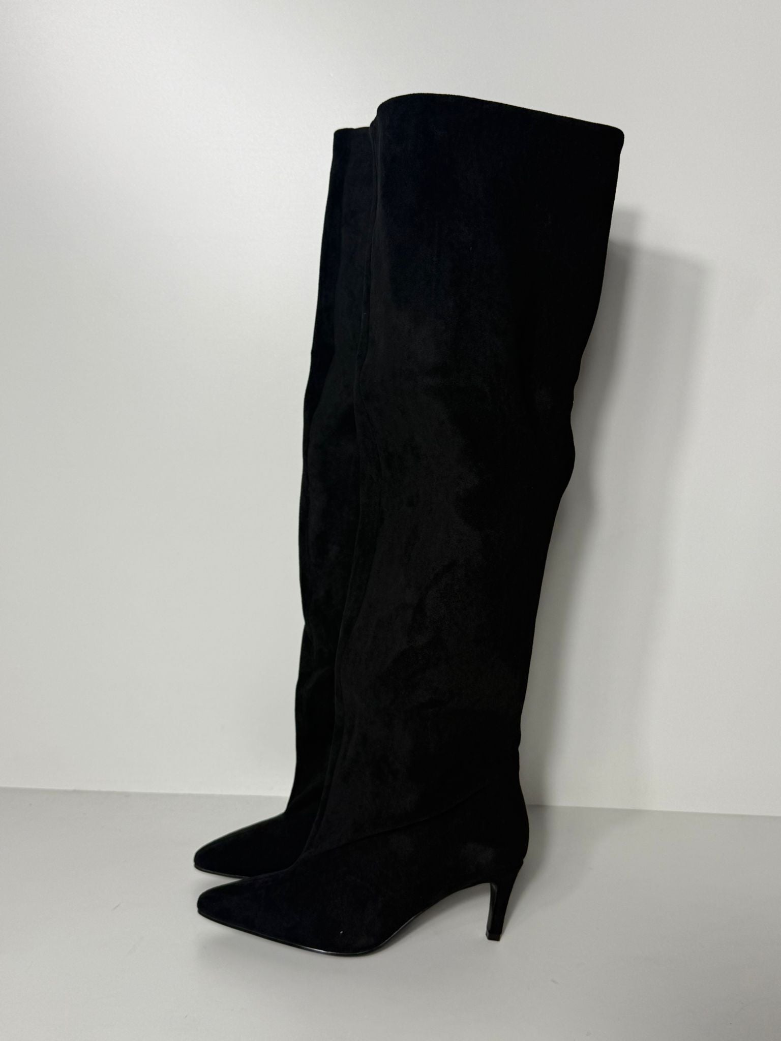Accessorio chic ed elegante per la stagione fredda. Lo stivale Kandy è realizzato in eco camoscio con un comodo tacco da 7cm e un gambale ampio che arriva sopra il ginocchio. Aggiungi un tocco di stile al tuo outfit e proteggiti dalle temperature rigide.